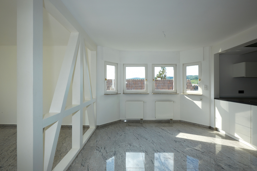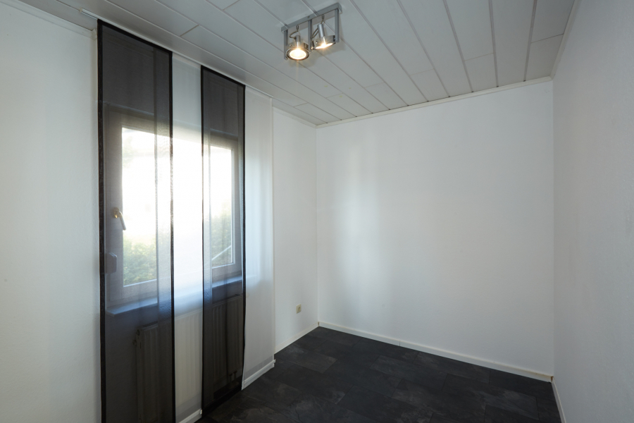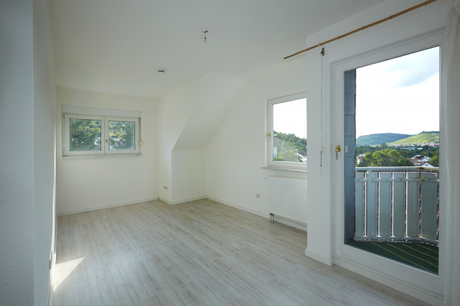 m Obergeschoss erwartet Sie ein großzügiger Wohn- und Essbereich mit offener, weiß lackierter Küche, die mit Elektrogeräten ausgestattet ist. Von hier aus gelangen Sie direkt auf den Südwest-Balkon und genießen die Sonne und den Blick ins Grüne. Zusätzlich steht ein weiteres Zimmer zur Verfügung, das sich ideal als Schlafzimmer oder Homeoffice nutzen lässt, sowie ein separates WC.