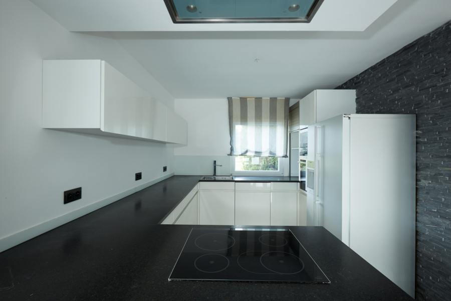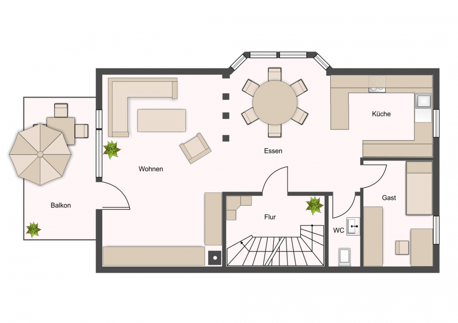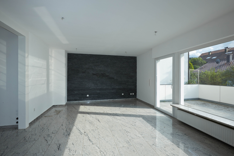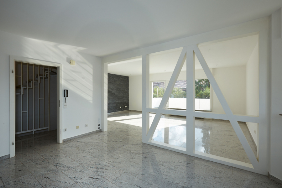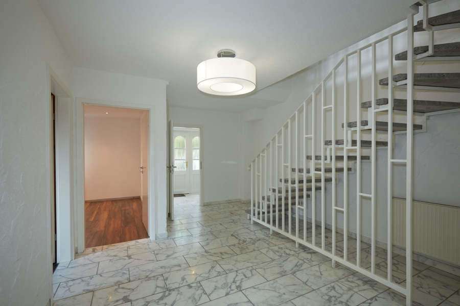 Die Böden im Haus sind überwiegend mit hellem Naturstein gestaltet, der sich auch im offenen Treppenhaus fortsetzt. Wände und Decken sind verputzt, tapeziert und in hellen Tönen gestrichen.