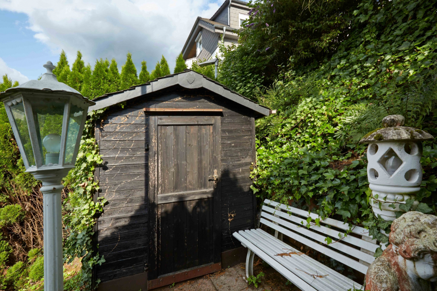 Ein besonderes Highlight sind die vielfältigen Außenbereiche: eine große, überdachte Terrasse, zwei Balkone sowie ein verwunschener, kaum einsehbarer Garten mit Gartenhäuschen. Hier lässt es sich wunderbar erholen, spielen und das Leben im Freien genießen.