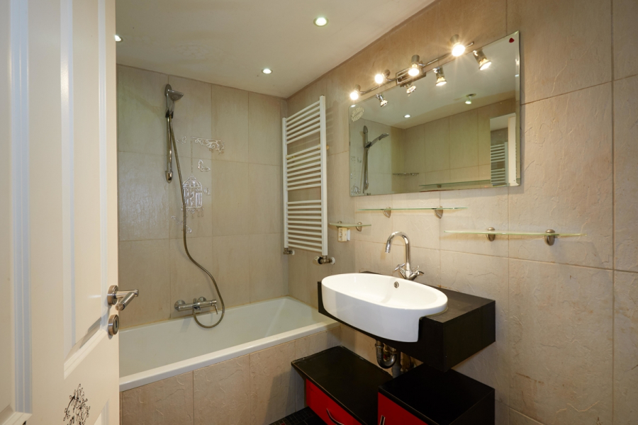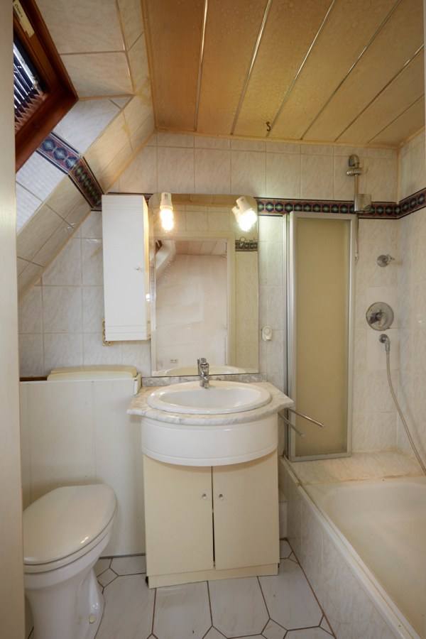 Sanitärausstattung: Im UG innenliegendes Bad mit Dusche und Waschbecken, im EG WC-Raum mit Fenster (derzeit als Waschmaschinenraum genutzt). Im Anbau befindet sich ein innenliegendes Bad mit Badewanne, Wachbecken und WC, im DG ein Tageslicht-Bad mit Dusche, Waschbecken und WC.