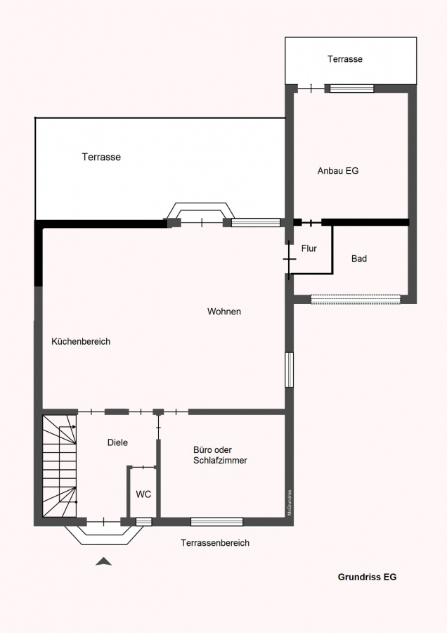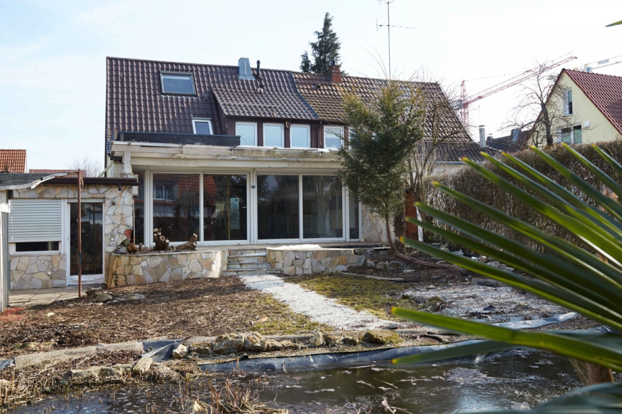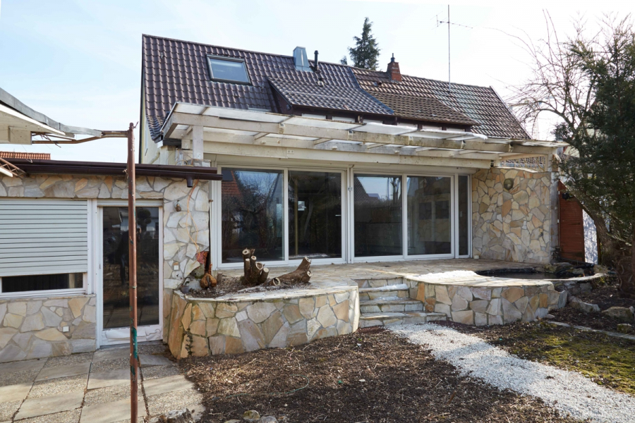 Terrassenfläche vor dem Hobbyraum ca. 11 m², zusätzliche Terrassenfläche vor dem Haus ca. 9 m². Die ausgebaute Fläche im Anbau ist nicht als Wohnfläche genehmigt.