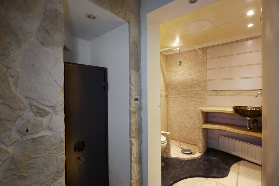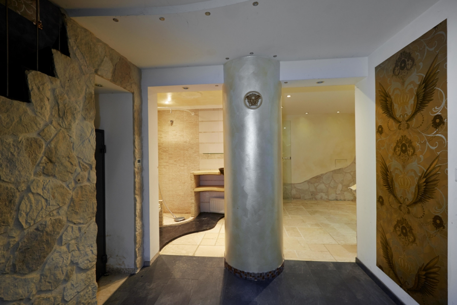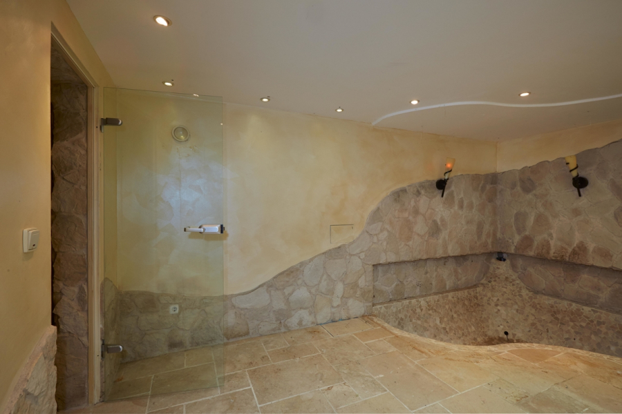 Böden und Wände sind im Innenbereich und im Außenbereich teilweise mit hochwertigem Travertin-Naturstein belegt und verkleidet.