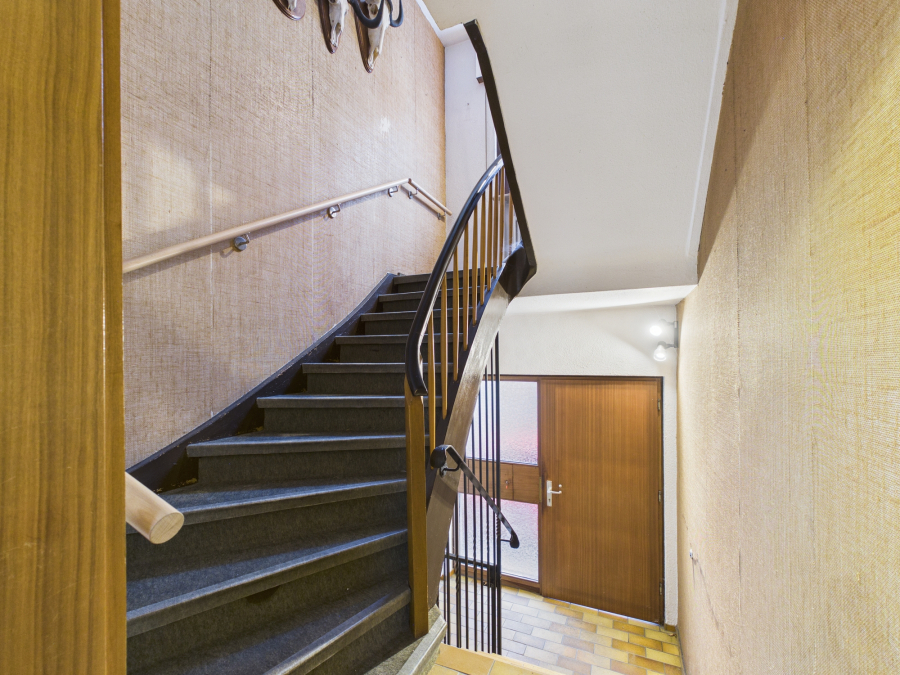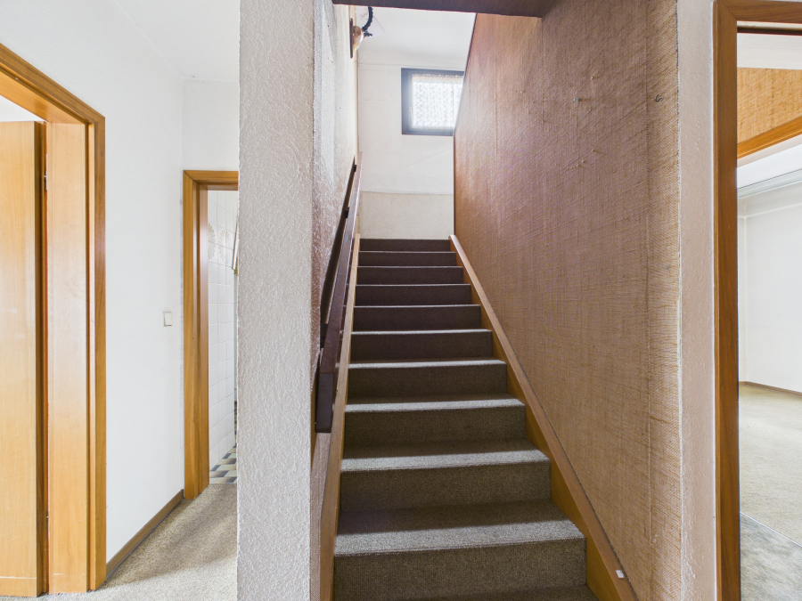 Die einzelnen Ebenen sind mit einer Holztreppe verbunden. Im Hochparterre befinden sich 4 Zimmer und ein separates WC welche nach dem Umbau 1977 als gewerblich Räumlichkeiten genutzt wurden (Anfrage über letzten genehmigten Stand ist in Bearbeitung und eine Nutzungsänderung in Wohnräume kann beantragt werden). Im Obergeschoss befindet sich ein Zimmer, der Wohn-Essbereich mit offener Küche und ein separates WC. Das Dachgeschoss hat drei Zimmer und ein Tageslicht-Bad mit Dusche und Doppelwaschbecken, und einem separaten WC. Eine weitere Holztreppe führt zum kleinen Gästezimmer und Bühnenraum.