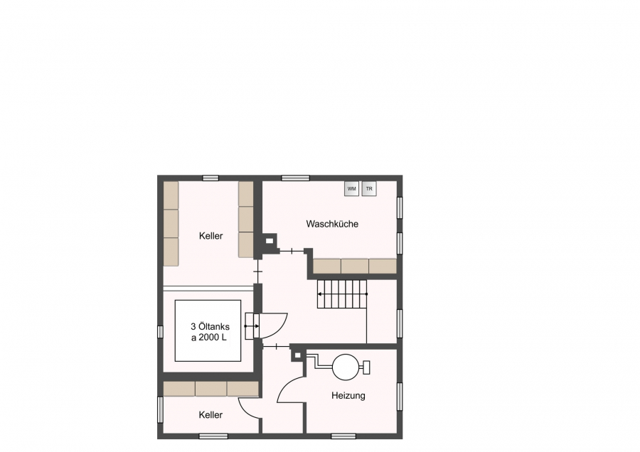 Im Untergeschoss befindet sich der Keller mit einer Waschküche, drei Kellerräume, davon ein Kellerraum mit 3 Öltanks und ein Heizungskeller, ein weiterer Kellerraum und einem sanierten Gewölbekeller.