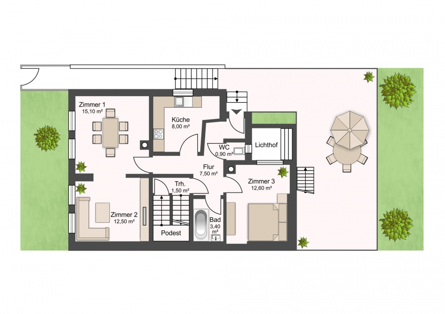 Kleiner Vorgarten an der Straßenseite, Garten mit Sitzplatz hinter dem Haus