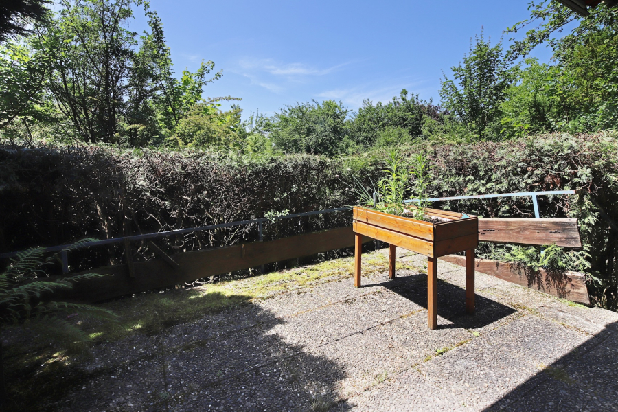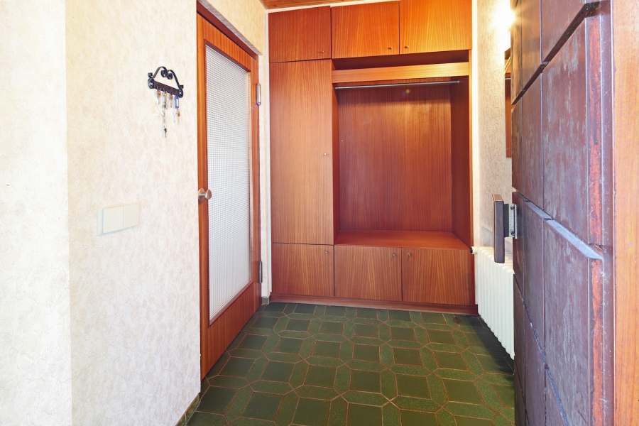 Bereits der Eingangsbereich empfängt Sie mit einem praktischen Windfang, der in das offene, zentral gelegene Treppenhaus führt. Von hier aus öffnet sich der großzügige Wohn-/Essbereich mit Zugang zur sonnigen Terrasse und einer Einbauküche aus dem Baujahr.
