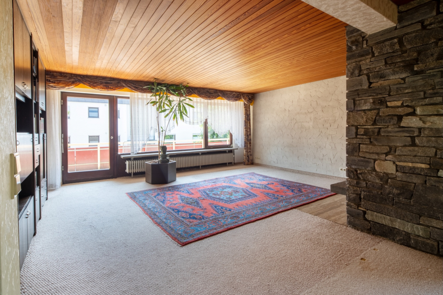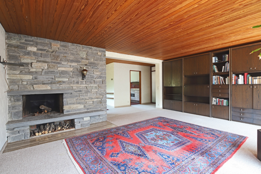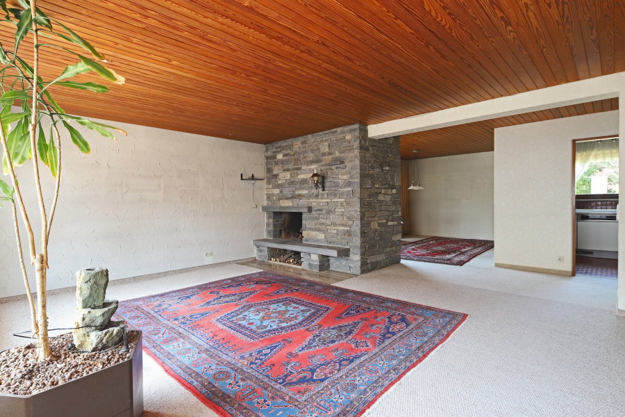 Die Decken des Hauses sind baujahrestypisch überwiegend mit Holz verkleidet. In den Wohnräumen ist Teppichboden verlegt, während Küche, Bäder und das UG mit Fliesen ausgestattet sind.