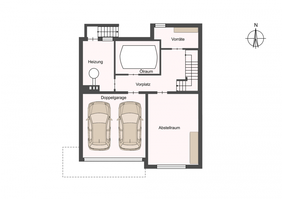 Das Untergeschoss bietet neben den klassischen Funktionsräumen (Heizung/Technik, Waschkeller) auch eine direkt angebundene Doppelgarage mit viel Platz für zwei Fahrzeuge.