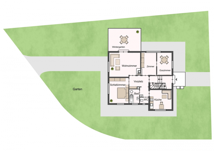 Besonders hervorzuheben ist der großzügige Wintergarten, der den Wohnraum erweitert und einen schönen Übergang zum Garten schafft.