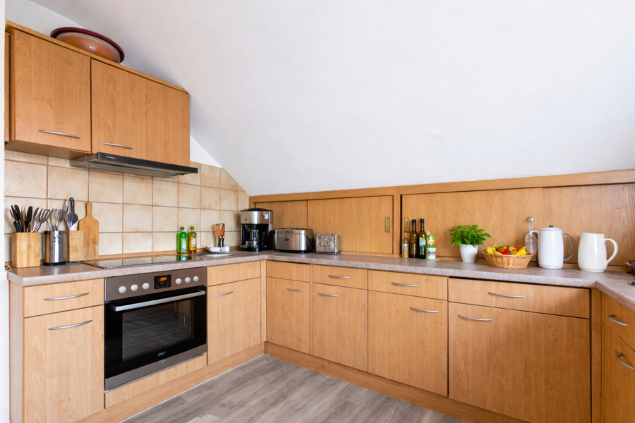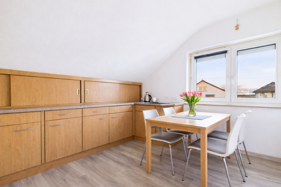 Im Dachgeschoss befindet sich eine gemütliche, kleinere Wohneinheit mit charakteristischen Dachschrägen, die eine besondere Wohnatmosphäre schaffen.