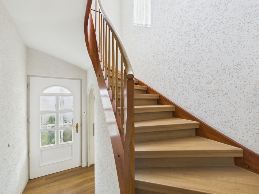 Im Treppenhaus verbindet eine im Jahr 2024 modernisierte und mit Laminat versehene Holztreppe die einzelnen Etagen miteinander und schafft eine warme, wohnliche Atmosphäre.