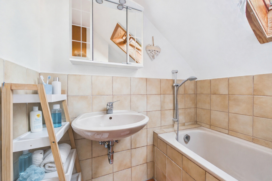 Das Dachgeschoss wurde teilweise modernisiert und präsentiert sich in einem gepflegten Zustand. Hier wurde Laminat verlegt, während das Badezimmer gefliest ist und über ein Dachfenster verfügt.