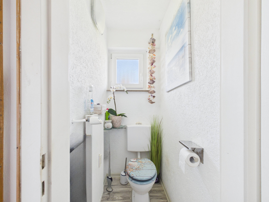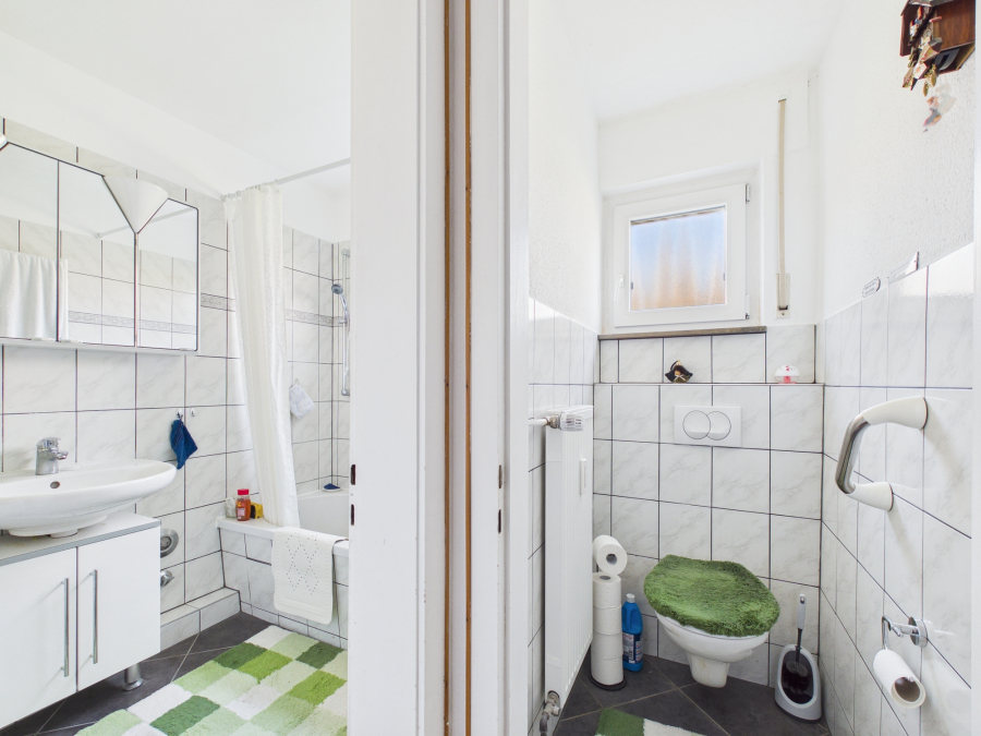 Im Erd- und im Obergeschoss gibt es jeweils ein Tageslichtbad mit Badewanne und Duscharmatur und Waschbecken. Hier gibt es jeweils ein separates Tageslicht-WC.