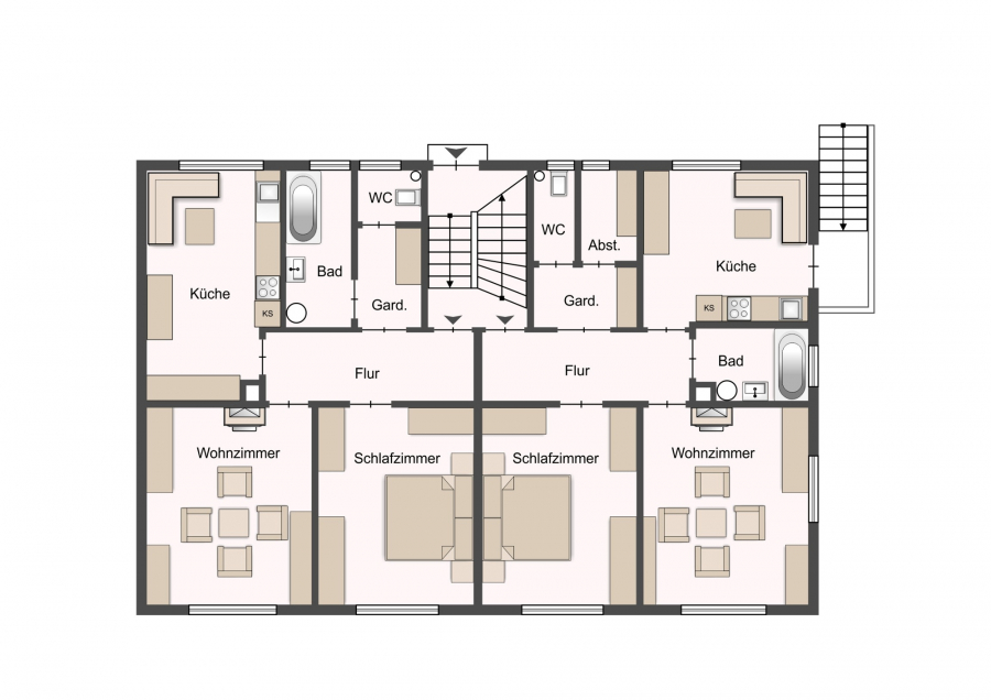 - Bad: Boden- und Wandfliesen, Holzdecke, Doppel-Waschtisch, Dusche, Badewanne, WC