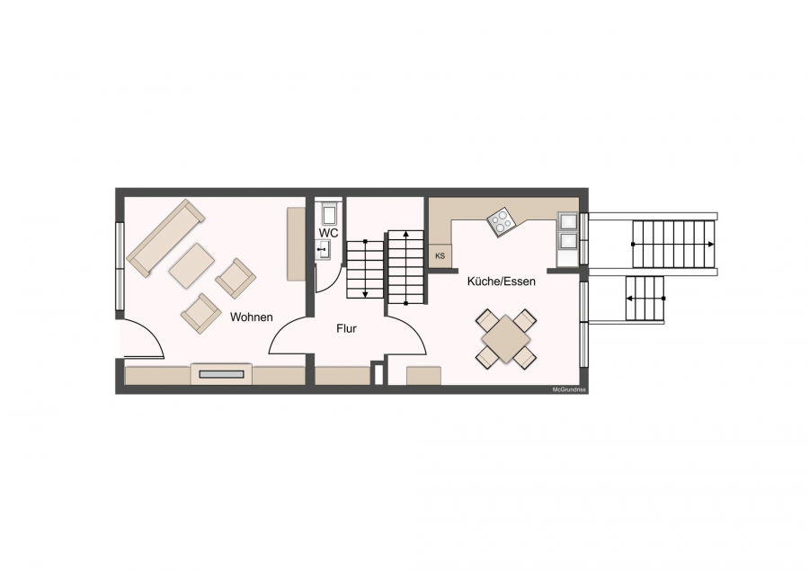 Obergeschoss: Küche mit Essecke, Wohnzimmer und Gäste WC