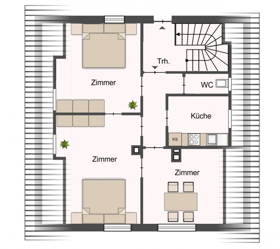 DG: 3-Zimmer-Wohnung, ca. 56 m² mit Flur, Wohn-/Esszimmer, Schlafzimmer, Arbeits-/Kinderzimmer, Küche, WC mit Tageslicht.