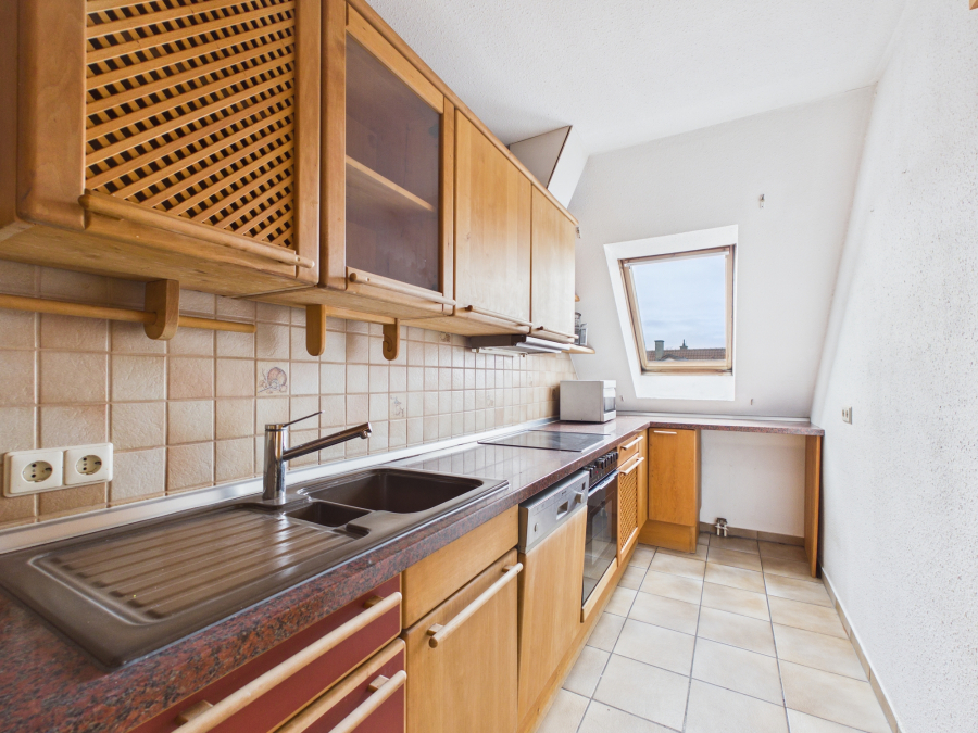 Diese Wohnung besitzt einen großzügigen Wohn- und Essbereich und einen direkten Zugang zum Balkon mit weitreichender Aussicht. Ein geräumiges Dachstudio, welches auch als Atielier oder Büro genutzt werden kann, ein Schlafzimmer, eine Einbauküche mit Geräten, Tageslicht-Badezimmer mit einer Eckbadewanne, einer Duschkabine und einem Waschbecken. Ein separates WC mit Waschbecken. Die Beheizung der gesamten Wohnung erfolgt über eine Zentralheizung mit Warmwasserbereitung.