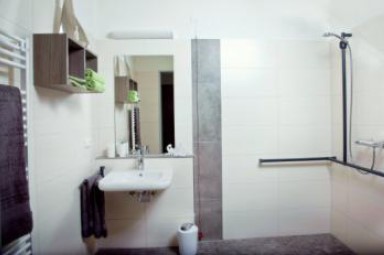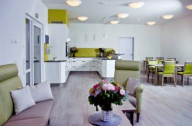 Alle Bewohnerzimmer verfügen über ein eigenes Badezimmer mit Dusche, WC und Waschtisch Jeder Wohngruppe ist ein Gemeinschaftsraum mit Wohnküche zugeordnet.