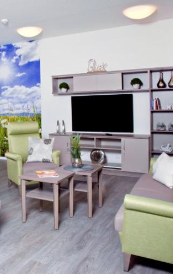 Alle Bewohnerzimmer verfügen über ein eigenes Badezimmer mit Dusche, WC und Waschtisch Jeder Wohngruppe ist ein Gemeinschaftsraum mit Wohnküche zugeordnet.