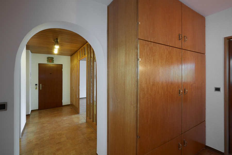 Über den breiten Flur und die Diele mit praktischem Einbauschrank sind alle Zimmer, die Küche, das innenliegende Bad sowie das separate WC direkt erreichbar. Der lichtdurchflutete Wohn- und Essbereich mit großen Fensterflächen bietet Zugang zum sonnigen Südbalkon mit herrlichem Blick ins Grüne und auf die Altstadt.