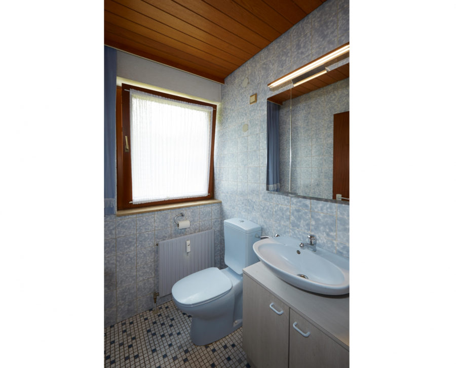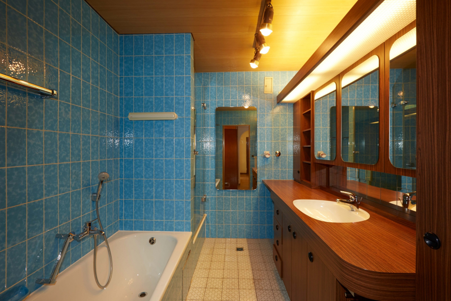 Das innenliegende Bad im Retrostil verfügt über eine Badewanne, eine separate Dusche, Waschbecken, Spiegelschrank und einen Waschmaschinenanschluss. Das Tageslicht-WC ist separat, beide Sanitärräume sind raumhoch gefliest.