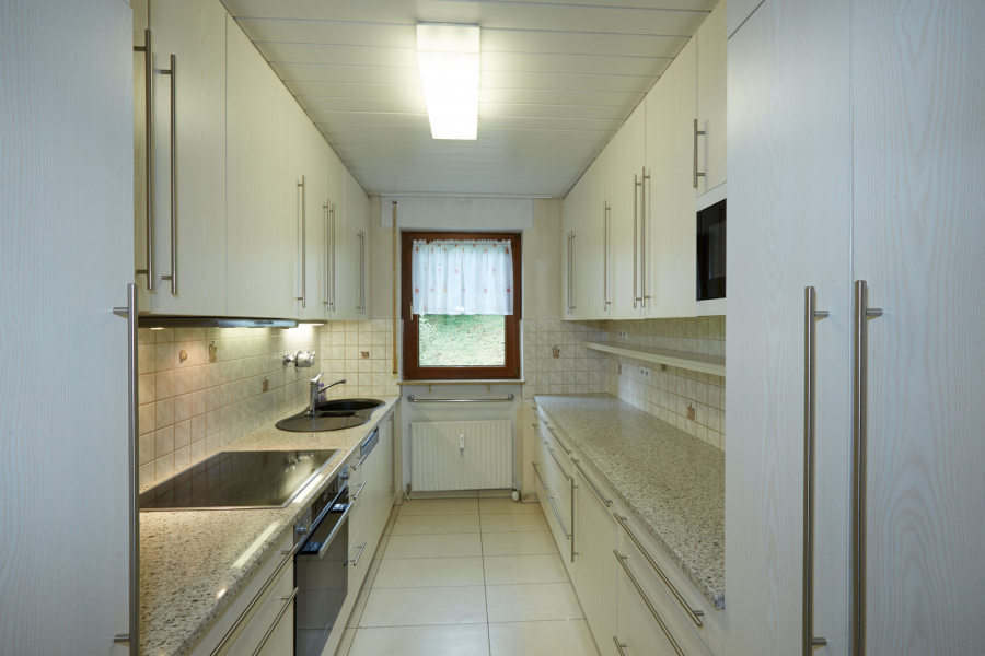 Die Einbauküche mit Geräten wurde vermutlich in den 80er Jahren eingebaut, ist aber in einem guten Zustand und mit einer Steinarbeitsplatte ausgestattet.