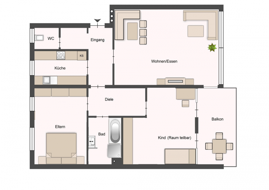 Die Wohnung verfügt zudem über ein geräumiges Elternschlafzimmer sowie ein großes weiteres Zimmer, das sich flexibel als Kinder-, Gäste- oder Arbeitszimmer nutzen bzw. sich in zwei Zimmer teilen lässt. Damit eignet sich das Objekt perfekt für eine Familie mit zwei Kindern oder für Paare, die zusätzlich ein Homeoffice wünschen.