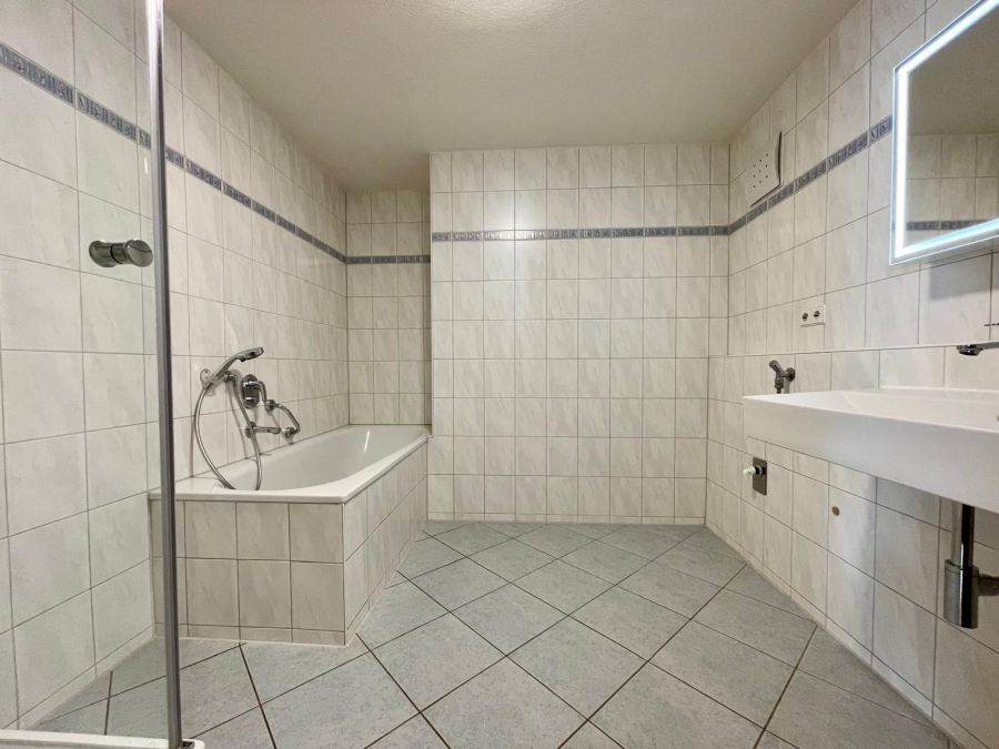 Die moderne Einbauküche ist mit hochwertigen Markengeräten von Siemens und Miele ausgestattet. Das Badezimmer bietet eine Badewanne, eine separate Dusche, ein Waschbecken sowie einen Waschmaschinenanschluss. Zusätzlich steht ein separates WC zur Verfügung.