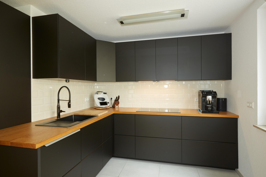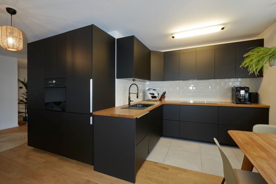 Die Wohnung verfügt über eine stilvolle, offene Einbauküche, die mit modernen Geräten ausgestattet ist und das Herzstück des Wohnbereichs bildet.