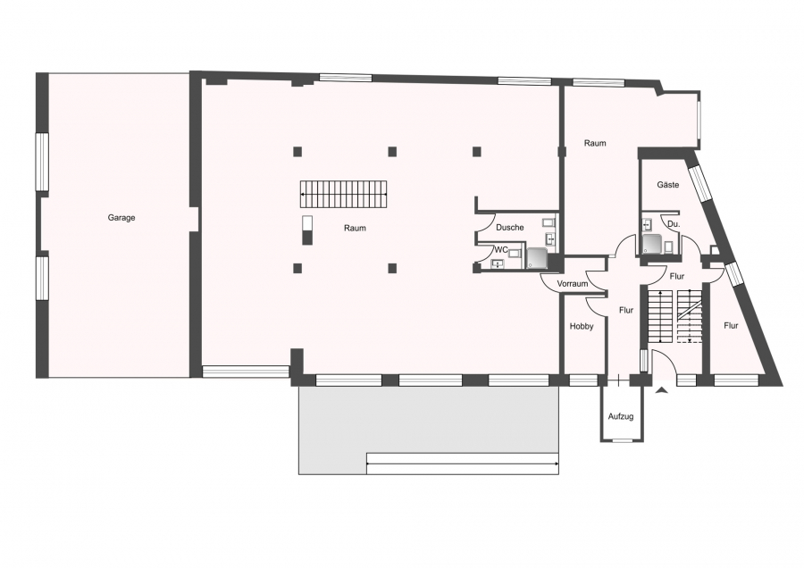 Ein Personenaufzug ist außen angebracht. Ein Lastenaufzug, erleichtert den Transport von schweren Gegenständen.