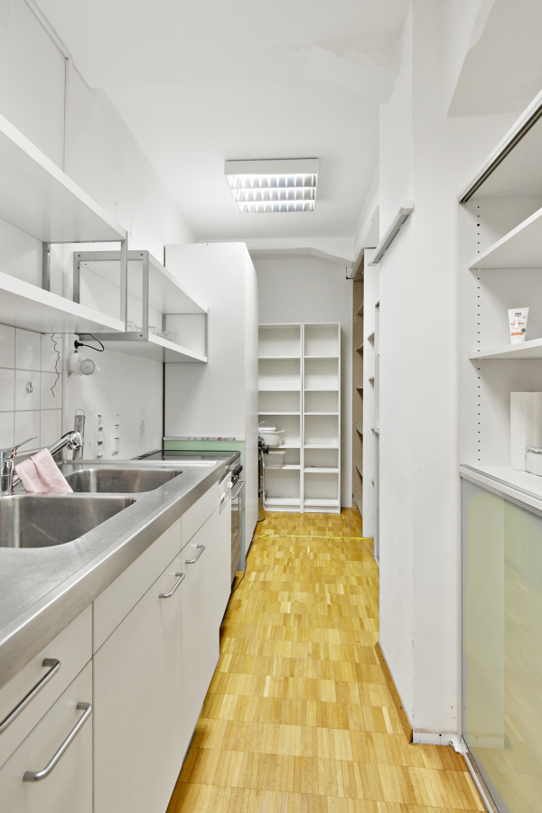 Die offene Treppe führt Sie in das Untergeschoss, das perfekt als Gewerbeteil genutzt werden kann. Ob Atelier, Büro oder sogar eine Kindertagesstätte, welche ursprünglich geplant war. Die vielseitigen Nutzungsmöglichkeiten machen diese Einheit zu einem wahren Juwel. Zusätzliche Annehmlichkeiten wie eine kleine Teeküche und ein Duschbad mit WC bieten weiteren Komfort und Flexibilität.