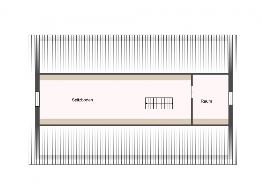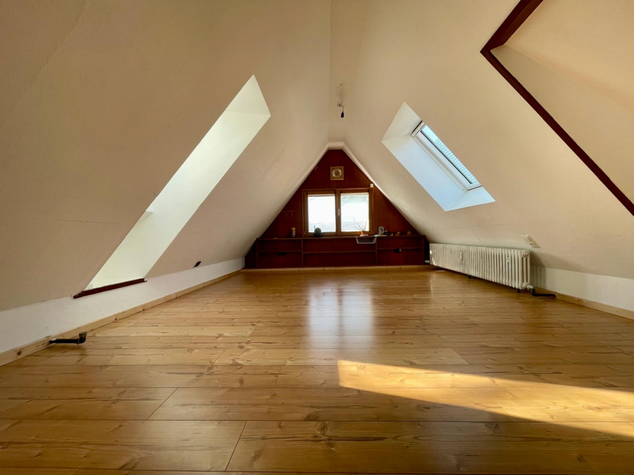 Eine innenliegende Treppe führt auf den Spitzboden. Ein Teil des Spitzbodens wurde mit einer Wand abgetrennt um einen weiteren Raum zu schaffen. Der Spitzboden bietet zusätzlich ca. 59 m² Nutzfläche.
