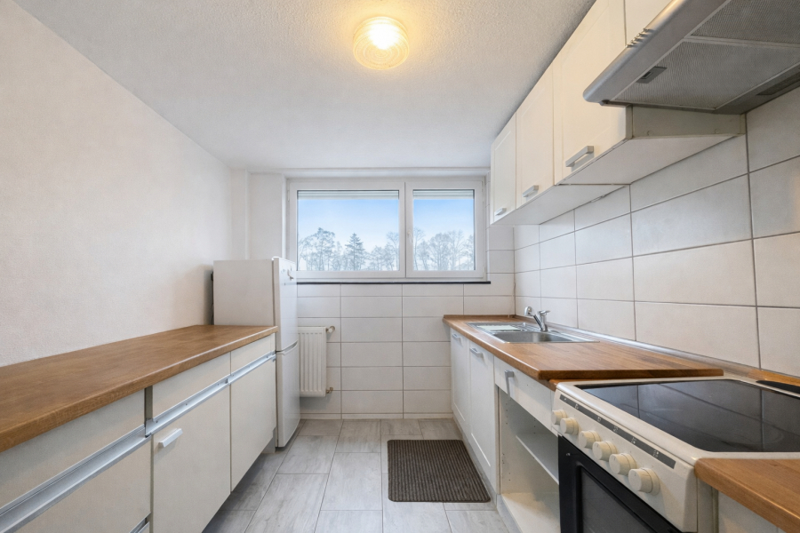 Über den Flur sind alle Räume der Wohnung bequem erreichbar. Die Wohnung umfasst zwei Zimmer, eine Einbauküche sowie ein Badezimmer.