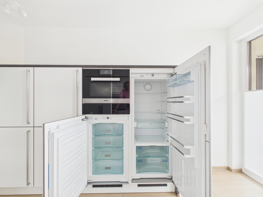 Es ist eine hochwertige Einbauküche mit Markengeräten (inklusive Induktionsherd, Kühlschrank, Gefrierschrank, Backofen mit Dampfgarfunktion und Warmhalteschublade) von Miele, Liebherr und Neff.