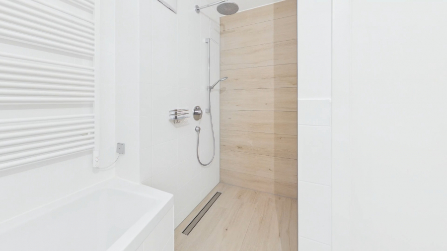 Beide Badezimmer haben Duschen, Waschbecken und WC, und im großen Bad ist zusätzlich eine Badewanne, ein Handtuchheizkörper und der Waschmaschinenanschluss. In den Wohnräumen und Bädern ist Feinsteinzeug in Holzoptik als Bodenbelag und in den Bädern an den Wänden sind halbhoch Fliesen verlegt.