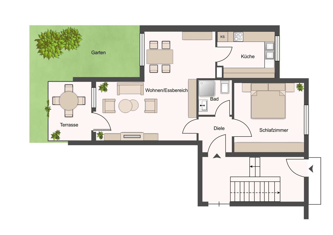 Die Terrasse (teilüberdacht) lädt zum Entspannen ein. Für den angrenzenden Gartenanteil steht dieser Wohnung ein Sondernutzungsrecht zu. In der Wohnung gibt es einen großzügigen Wohn-/ Essbereich mit Zugang zur Terrasse/Garten, einen separaten Küchenraum sowie ein Schlafzimmer. In der Küche befindet sich eine Einbauküche inklusive Geräten. Das innenliegende Badezimmer ist mit einer Dusche, einem Waschbecken und WC ausgestattet. Zu der Wohnung gehören ein abgeschlossener Kellerraum mit Stromanschluss sowie ein Tiefgaragenstellplatz. Zu den Gemeinschaftsräumen zählen eine Waschküche mit separaten Anschlüssen für Wasser und Strom und ein großer Fahrradkellerraum.
